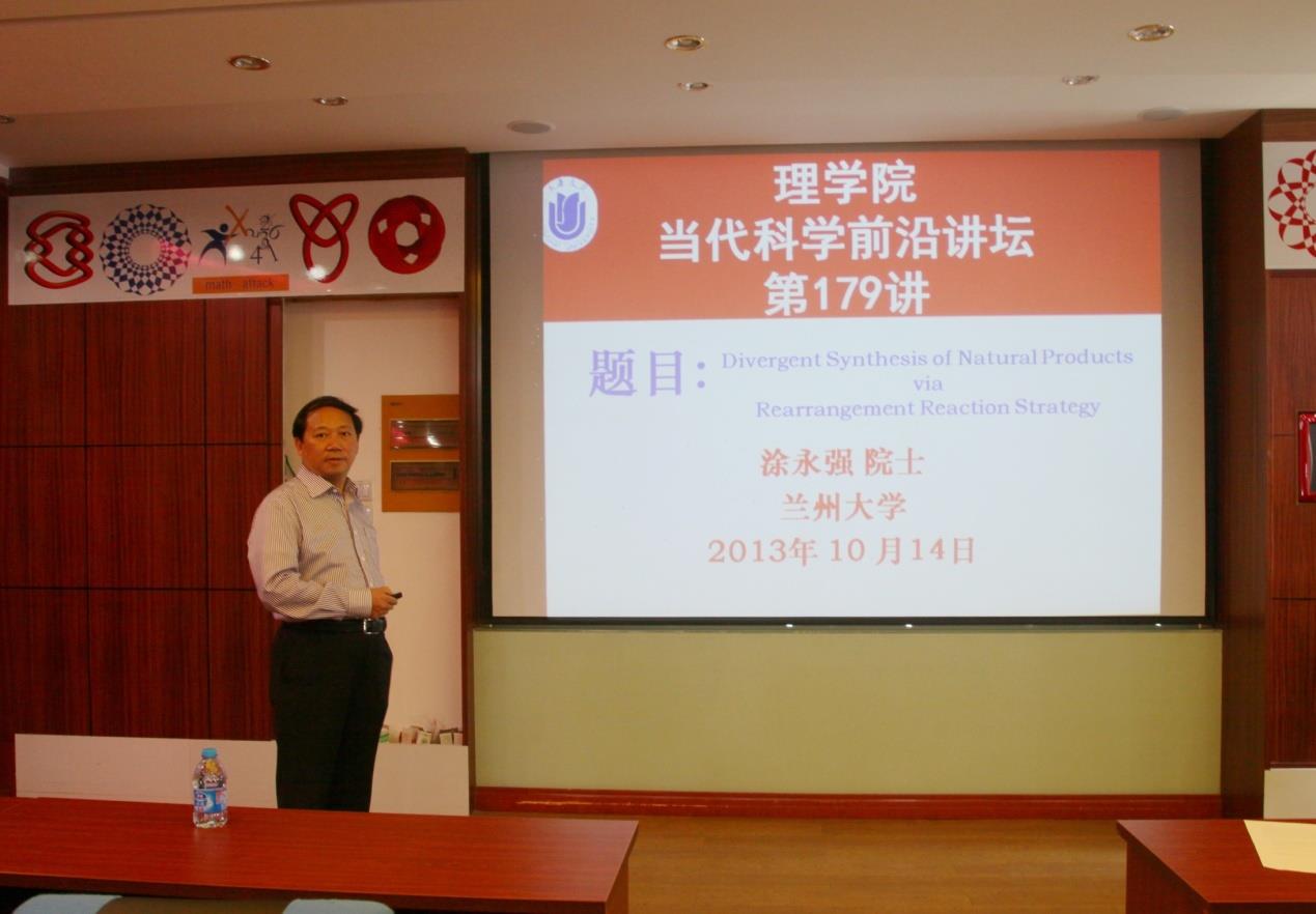 报告会上,涂永强院士结合自身多年来的科学研究,从课题组自己开发的有机重排反应合成具有各种生物活性的含季碳的复杂天然产物-生物碱以及具有抗癌、抗老年痴呆活性药物入手,就合成复杂结构药物所需的有机化合物砌块以及如何把这些砌块连接为目标分子进行了详细的阐述,并且图文并茂地介绍了多类重要天然产物合成的新策略。涂院士通过丰富的科研成果、创新的合成理念和详细的合成方法深入浅出的讲解,使每一位师生领略到了化学的独特魅力和涂院士勤奋、务实、认真做研究的人格魅力,涂院士广博的学术功底与渊博的学识给全体师生留下了深刻的印象,在场师生与涂院士进行了精彩的互动,涂院士对老师和同学们提出的问题进行了耐心详尽的解答。